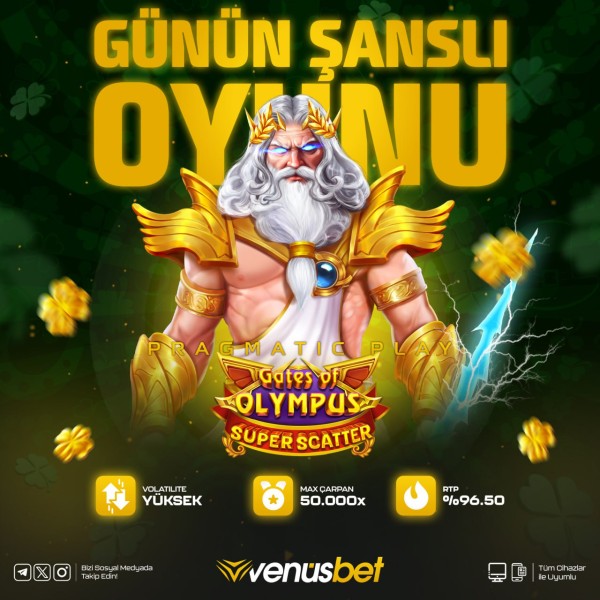 Pragmatic Play’in efsanevi oyunu Gates of Olympus, VenüsBet’te günün şanslı oyunu olarak öne çıkıyor. %96.5 RTP oranı, 50.000x maksimum çarpanı ve yüksek volatilitesiyle Zeus’un kapılarında devasa kazanç fırsatları sunuyor. Mitolojik atmosferiyle heyecanı doruğa çıkaran bu slot, büyük ödül peşindeki oyuncular için vazgeçilmez bir deneyim.