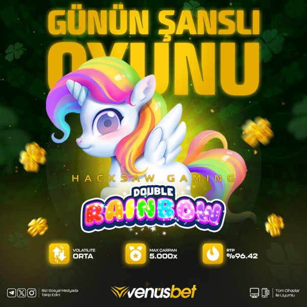 Hacksaw Gaming’in dikkat çeken oyunu Double Rainbow, VenüsBet’te günün şanslı oyunu olarak öne çıkıyor. Orta volatilite, %96.42 RTP oranı ve 5.000x maksimum çarpanıyla oyunculara kazançlı bir deneyim sunan bu slot, rengarenk tasarımı ve eğlenceli atmosferiyle öne çıkıyor. Farklı bir oyun tarzı arayan slot severler için hem görsel şölen hem de yüksek potansiyel bir seçenek.
